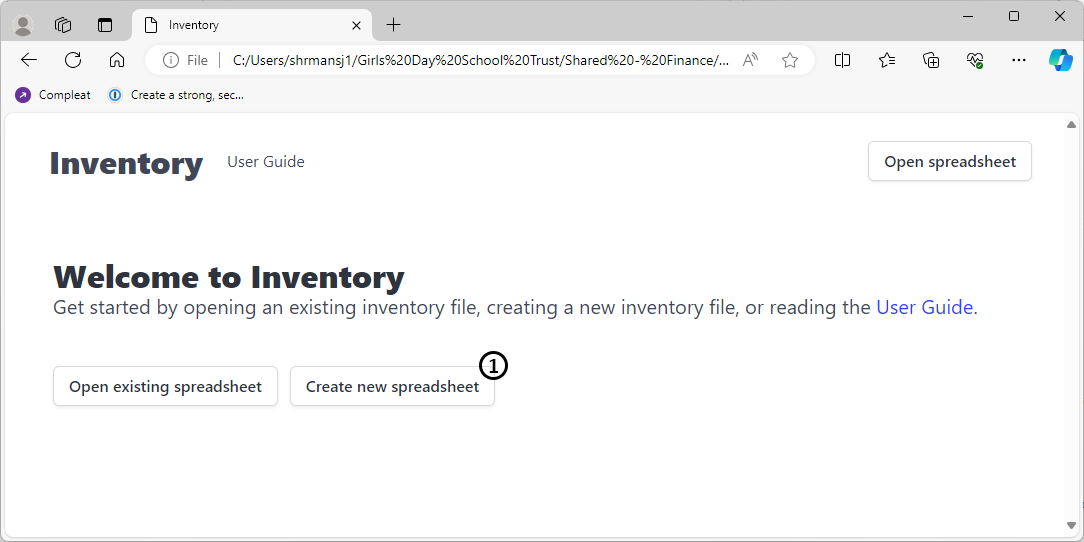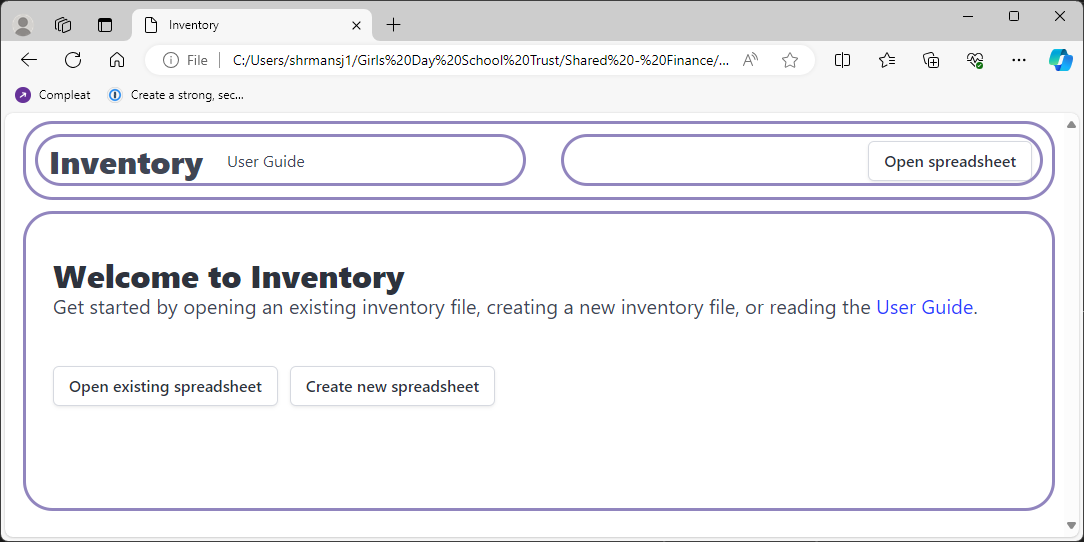 To create a new Inventory file, you may either use the Graphical User Interface to create an empty file (recommended), or you may create your own XLSX document (see technical notes).